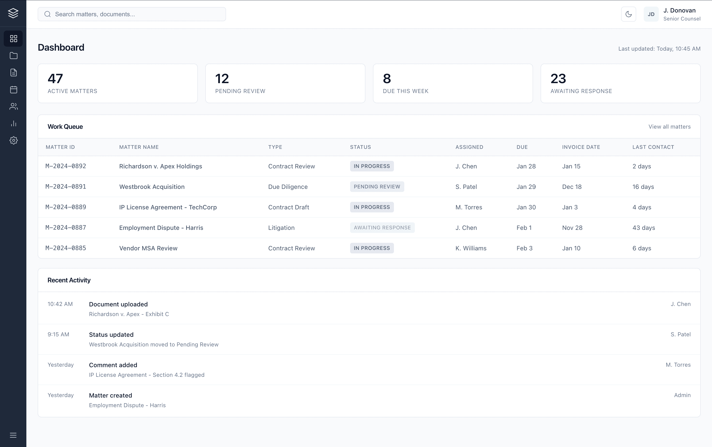 Throughout the design, automation was treated as a way to reduce time-to-judgment, not replace professional decision-making. The system’s role was to make the right next action obvious at the right moment without escalating, sending, or implying obligation on behalf of the attorney.